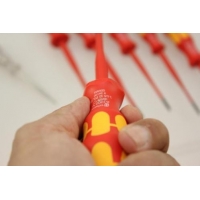 De veiligheids-schroevendraaier, voldoet aan de normen van de VDE. Met gereduceerde klingdiameter, handig bij het werken aan schakelkasten met weinig ruimte.